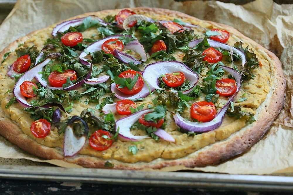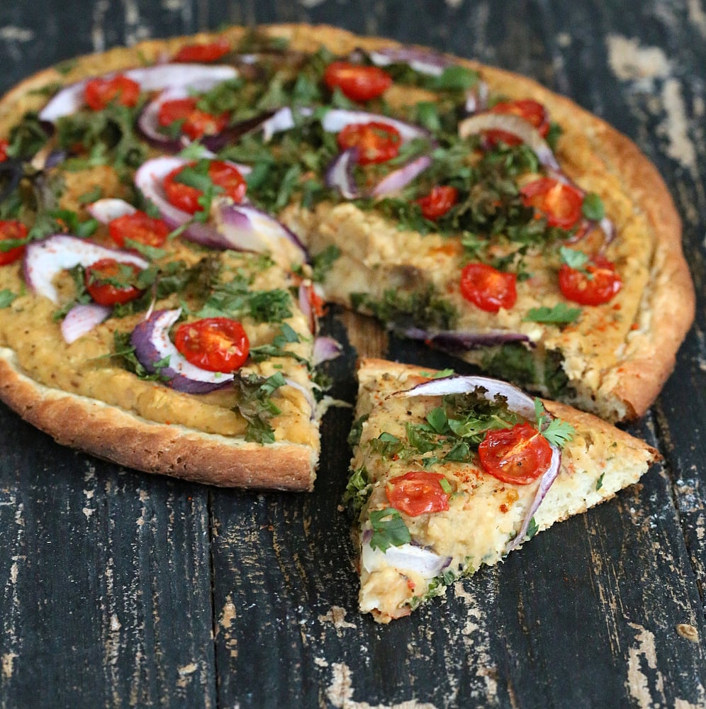 It takes like 5 minutes to prep and blend up the hummus. The hummus is delicious by itself, cheesy, smoky, spicy! If you already have a prepared pizza crust or use tortillas or lavash bread as a base for individual pizzas, then its just a few more minutes to bake, and the pizza is ready to be gorged upon(a few more minutes if you would like to save your palate from burning).