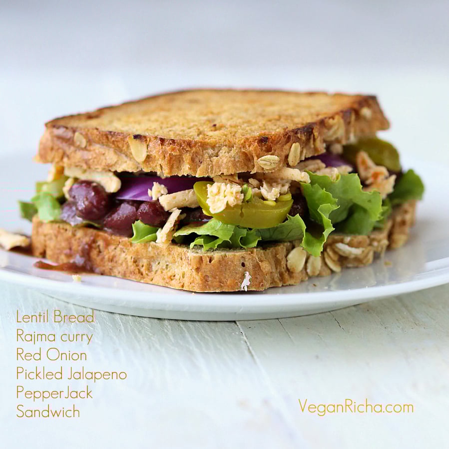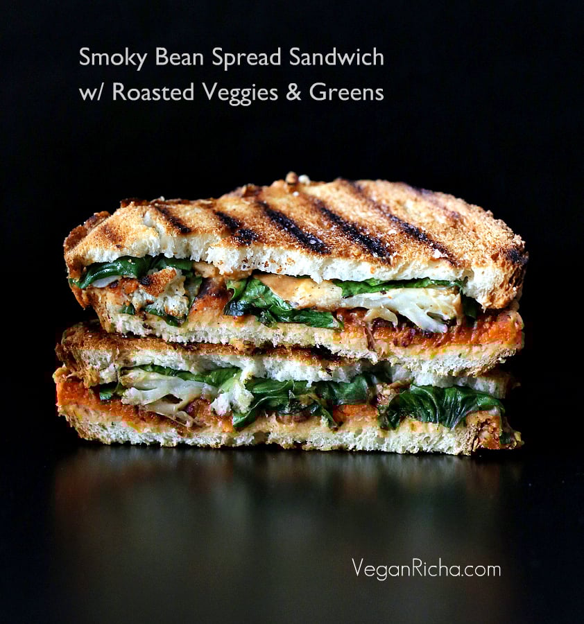 This Sandwich pictured above, has Roasted red pepper smoky dip, roasted cauliflower, roasted sweet potato slices and greens. Made with my White Sandwich Bread. The smoky cauliflower, sweet potatoes and the sweet pepper dip makes this a keeper. Roast the veggies, whip up the dip and keep ready. Put the bread slices on the grill, layer the veggies and hummus, grill up and serve. No Cheese needed. Add some vegan cheddar slices if you wish.Â