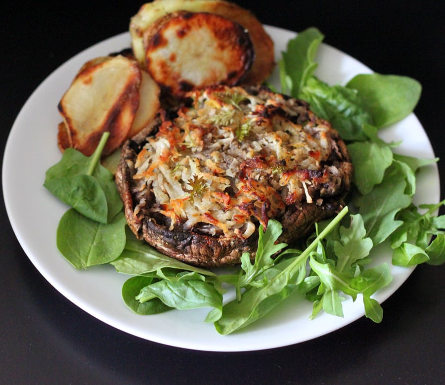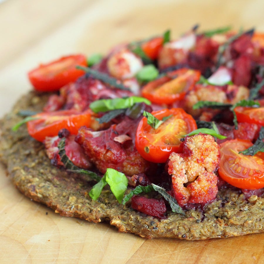 Layer greens, roasted veggies and hummus, salt, smoked paprika, and grill.
