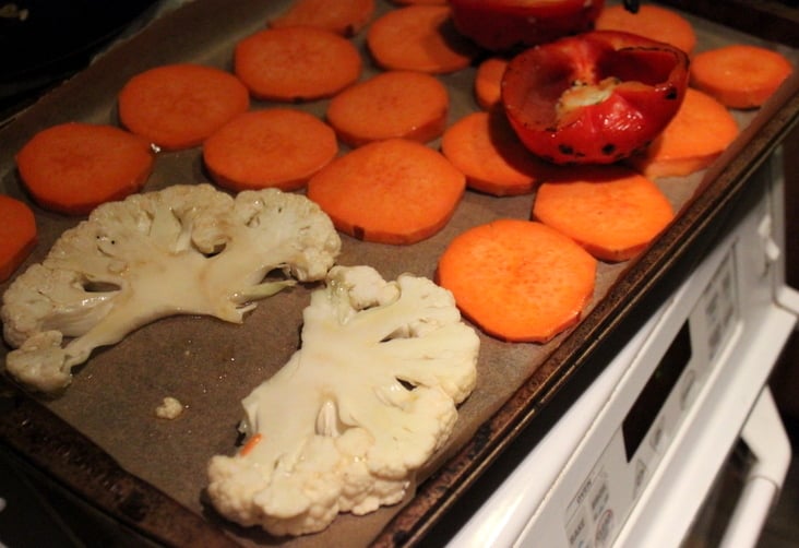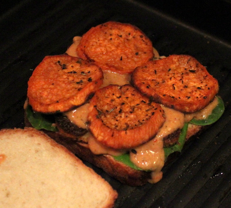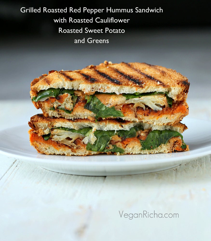 Grilled Smoky Roasted Red pepper hummus or bean dip Sandwich with Roasted Cauliflower  & Roasted Sweet Potato