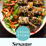 I love that the sesame-crusted tofu is baked in the oven and turns out super crispy without having to add any flour or breadcrumbs the to coating.