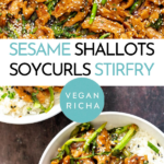 This Sesame Shallot Soy Curl Stir Fry makes for an amazing weeknight dinner that rivals any takeout meal. Soy curls marinated in a sweet-salty-spicy marinade, then stir-fried in sesame oil along with shallots and garlic. Chinese broccoli and Thai Basil are added along the way for that authentic flavor, and the rest of the marinade is also added to create a delicious stir-fry sauce. Serve this easy soy curl stir fry with rice, broccoli rice, zoodles or noodles!
