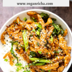 This Sesame Shallot Soy Curl Stir Fry makes for an amazing weeknight dinner! Chewy, marinated chicken like soycurls and broccolini in a sweet, salty and sticky Asian sesame stir-fry sauce! Nutfree Recipe Gluten-free option!