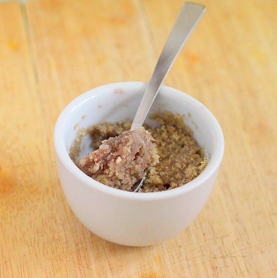 - For the crumb, mix all the dry ingredients, then add coconut oil. Using your hand, mix all the ingredients till the coconut oil is well distributed. Dont over mix as the oil will start to melt.