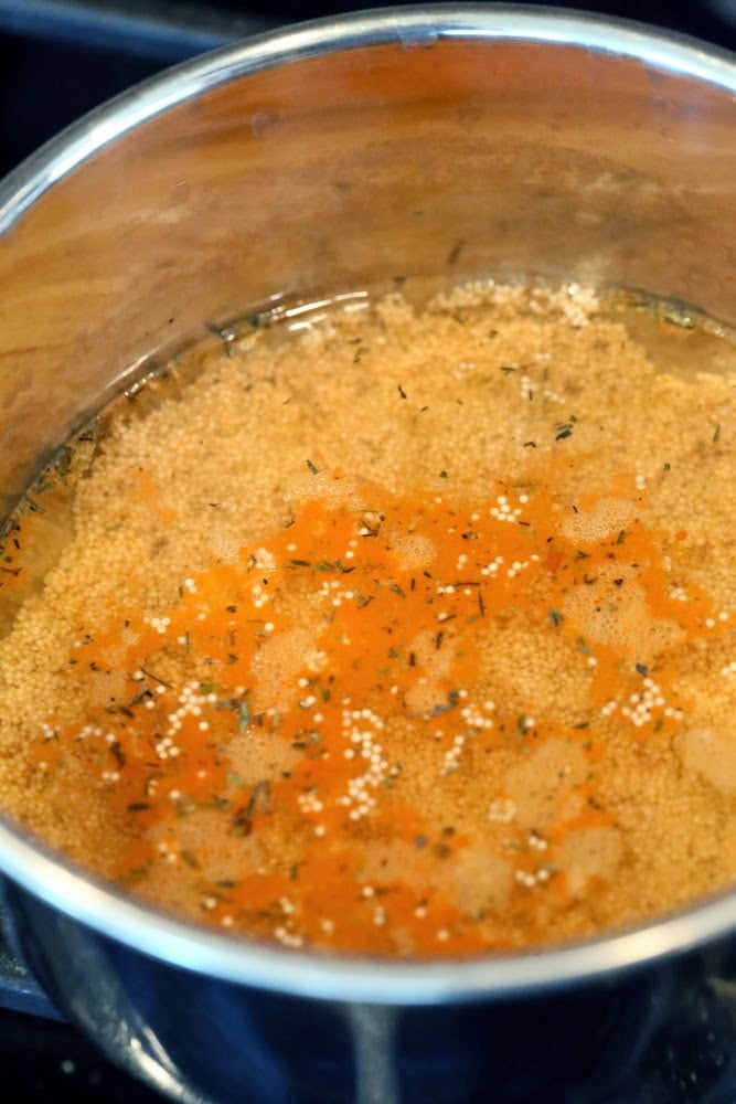 - Cook the amaranth: Wash and drain 1/4 cup amaranth. (You can skip the washing and directly cook the grain too). Heat a deep pan at medium, add washed amaranth to the pan and toast for half a minute. Add water, salt, thyme, paprika, mix and cook on medium heat. Reduce heat to medium-low once it starts to boil. Cook for 12-15 minutes or until the grains are tender. Stir once or twice towards the end to avoid sticking.
