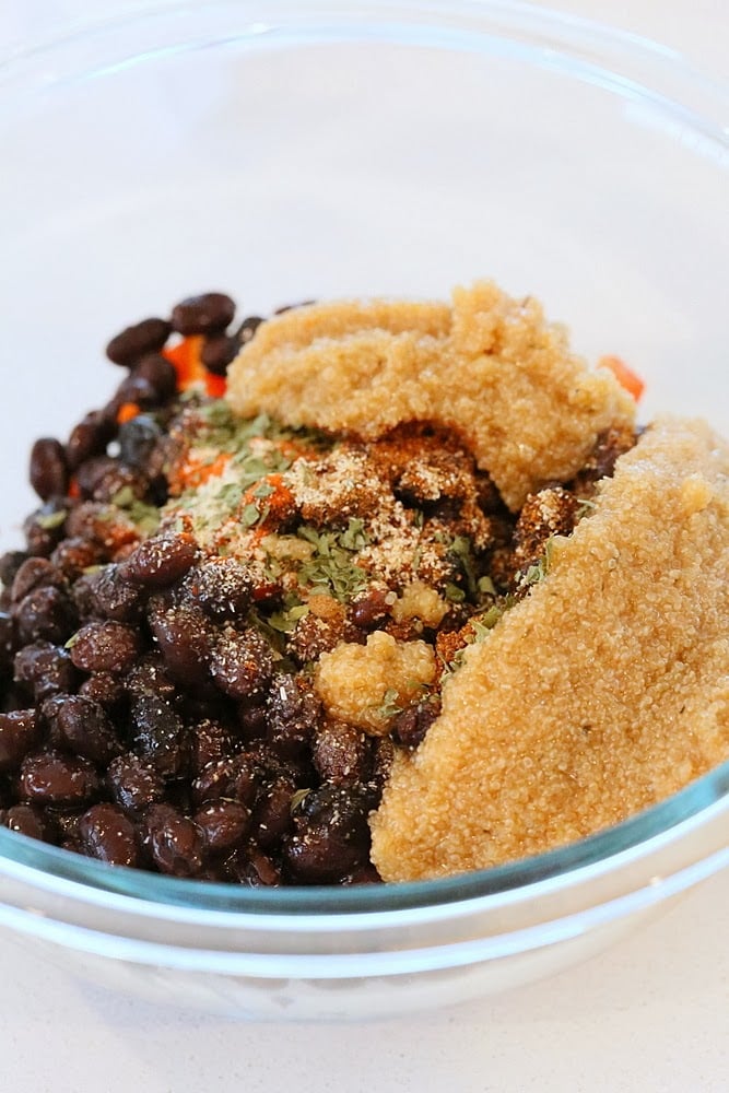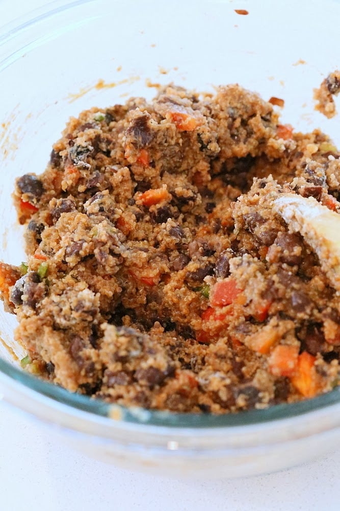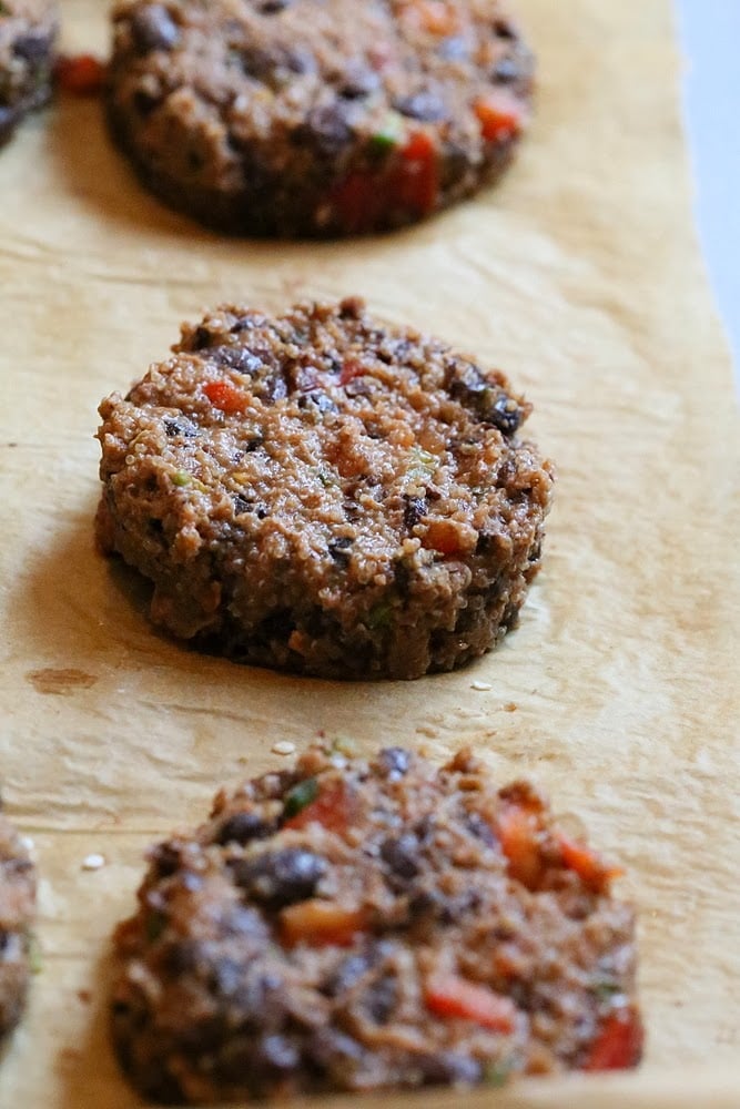 - Back to patties: Chop up the red pepper and chili, In a bowl, add black beans, peppers, salt and spices. Add the cooked amaranth and oil and give everything a good mix. Mash a bit to mash the black beans. Taste for spice and salt. Now add the brown rice flour to the mixture to make it less sticky. Add less or more just enough to handle the mixture without it being a sticky mess. Use a cookie cutter and press a good dollop of the mix into and through it to shape the patties on parchment lined baking sheet. Even them out and brush a little oil on top.(optional). I used 2 inch cookie cutter as my buns were 2.5 inches. and got 6 patties.