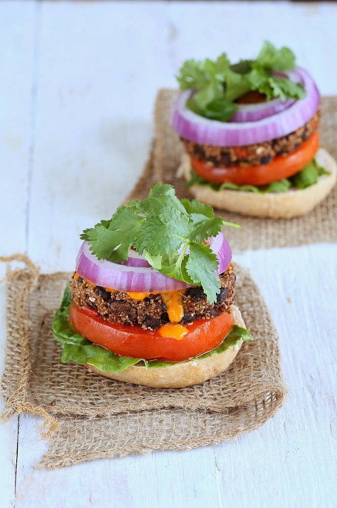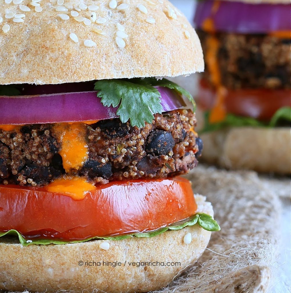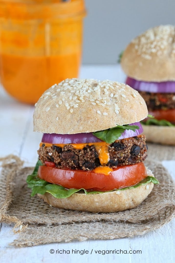 - Assemble the burgers. Layer lettuce/greens, a fat juicy tomato slice, hot patties, a good load of the roasted red pepper sauce, red onion slices, cilantro and bun.