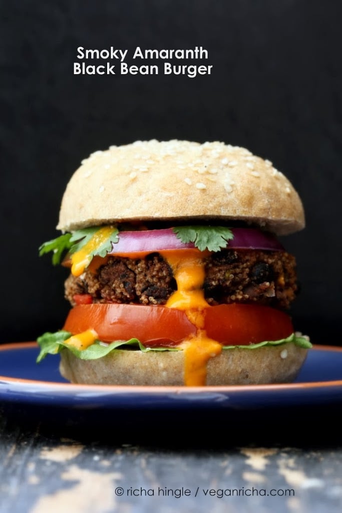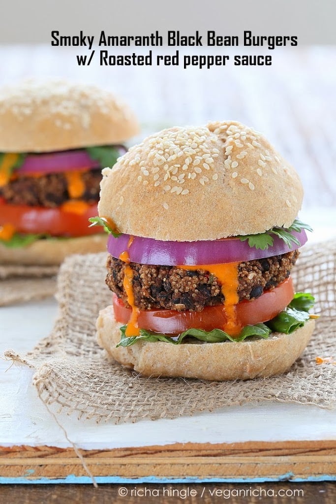 Amaranth grain in the patties is this tiny cute grain packed full of high quality protein, calcium, iron, b6, and lot of other nutrients! Black beans are rich in folate, protein, b1. With the beans and all the spices, amaranth adds texture to the patties without adding much of its own taste hence working very well for these burgers. The lightly sweet roasted red pepper sauce and juicy tomatoes work beautifully with the smoky and quite spicy patties.