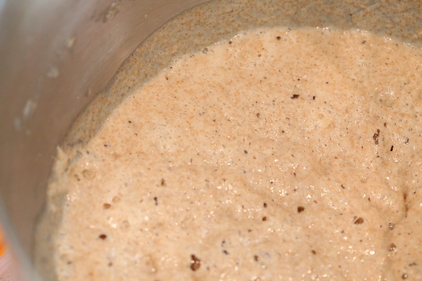 - Mix the ingredients under Sponge in a bowl. Mix with a large spoon for 2 minutes until the batter is very smooth and starting to get gluten-ny.