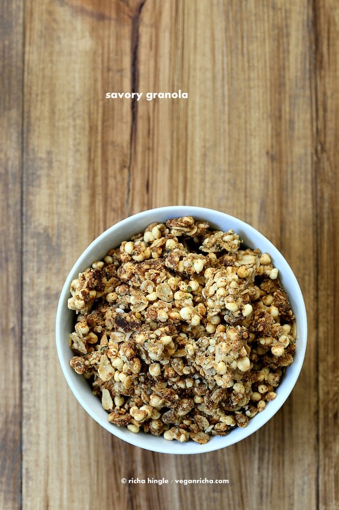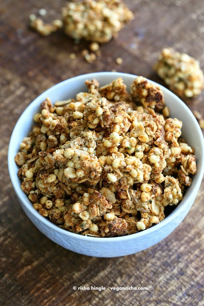 The granola has puffed millet, oats and hemp seeds, bound together by almond butter, coconut oil, sour buttermilk, tons of spices. You can use any puffed grain and seeds and change up the flavor profile as you go. You really need to make this. Is it a granola or a trail mix? or what should I call these clusters. I think it is more of a trail mix, since it is eaten as a snack as is, and its not added to milk or yogurt things. Ah well, the next savory one will be called a trail mix. 🙂 Don’t think of it as granola if that helps. Its just a crunchy savory snack like sour cream and onion chips.