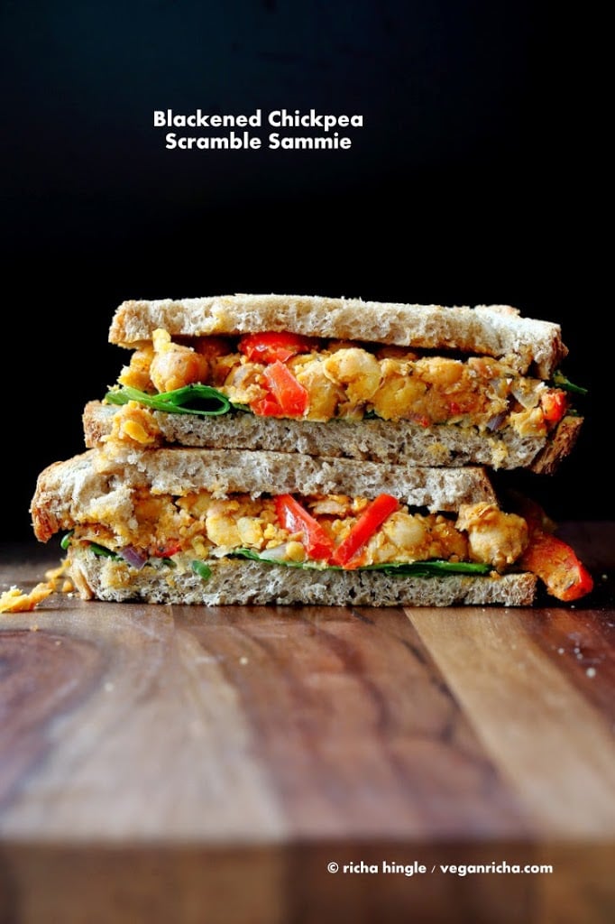 An Easy Scramble today. If you have been reading this blog for long, you know how hubbs and I both love a savory breakfast. to change things up, this scramble is made with chickpeas, scrambled up with blackening spice on high heat. with some red pepper to balance things out and in a sandwich with greens and hummus,