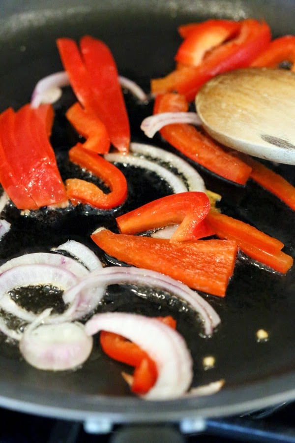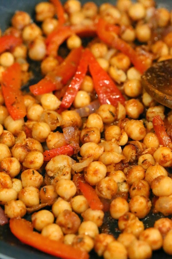 Drain the chickpeas. Toss the chickpeas in the blackening spice and let sit while you cook the peppers and onions.