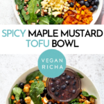Healthy, flavorful, and satisfying, this easy Spicy Maple Mustard Tofu Bowl with sweet potatoes crunchy baked marinated tofu is a vegan version of honey mustard chicken and is the perfect meal prep lunch bowl or weeknight dinner . Add any nut or fruit you like to make this yours!