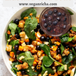 - Assemble your bowl by adding spinach or other greens of choice. Some blueberries, apples, a good helping of the baked tofu and the sweet potato. Drizzle with the dressing and serve.