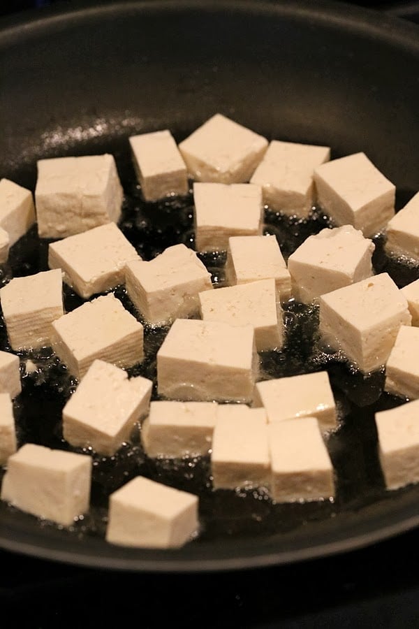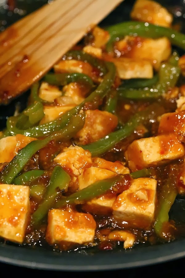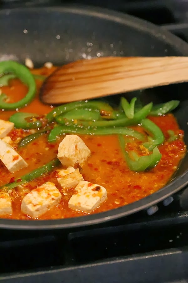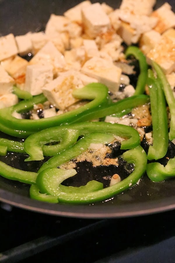 - Heat oil in a very large nonstick pan or wok over medium-high heat. Add tofu to pan and cook, browning on most sides, about 6-8 minutes. Cover the pan if there is too much sputtering. Add garlic and sliced bell pepper or blanched veggies and cook for half a minute. Add the sauce and cook until sauce begins to bubble(2-4 minutes). Then reduce heat, cover and cook for another 2 minutes. Serve with rice or other grains.