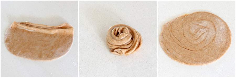 - Take a dough ball, press it into some flour, and flatten it. Roll it out with a rolling pin until it is about 6” in size. If making plain parathas, you can roll it out even more into almost a thick roti/chapati. If you want to make a lachha paratha, brush oil on the rolled out flatbread, then fold it accordion-style, from one end to the other(see pics and video), then roll it into a cinnamon-roll shape, then flatten, sprinkle on more flour, and roll out again. This creates nice, flaky layers in the spinach paratha. You can also make flaky spinach paratha by brushing oil on one side of the rolled out flatbread, folding it into a square or bringing the edges together like a dumpling, then rolling it out again.