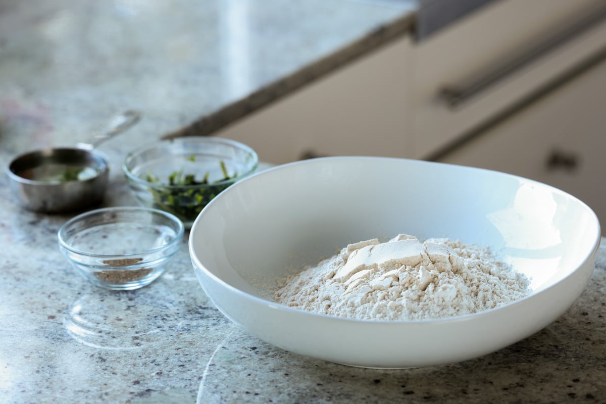 Rinse out the blender with 2 tablespoons of water and add that to the flour mixture. Mix and press the mixture until it starts to come together as a dough. You don’t want to add too much water, as the spinach holds a lot of moisture, so press and keep mixing for about a minute.
