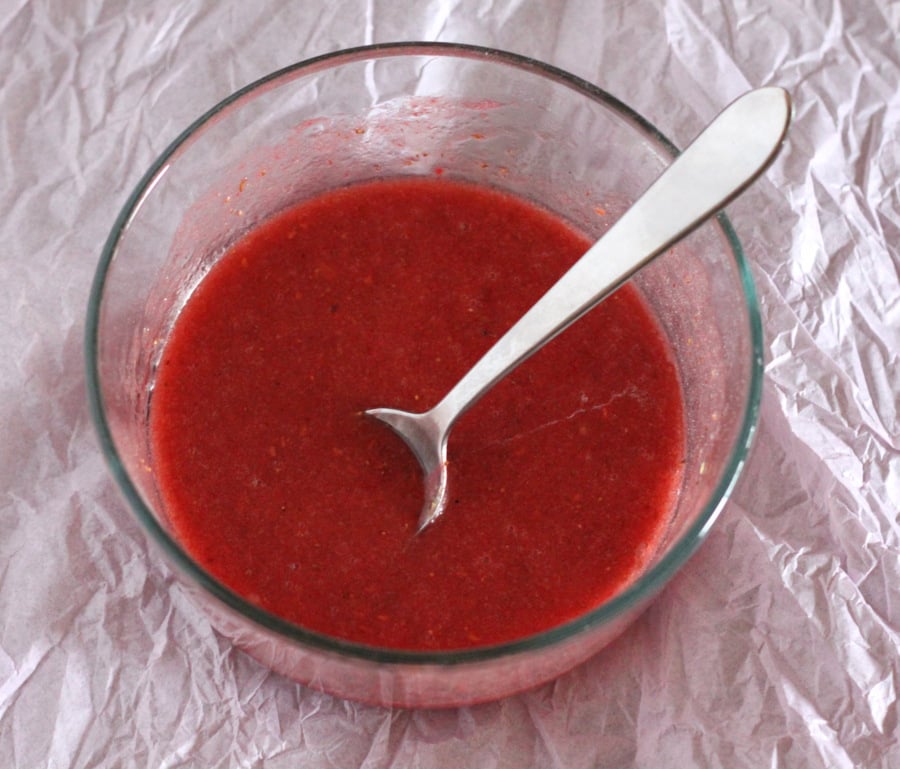 Puree the strawberries into a smooth puree and take 1/4 cup puree. Add a little beet and puree for a deeper color. I have used strawberry raspberry puree for a batch of doughnuts too. The raspberry gives it a gritty texture though.