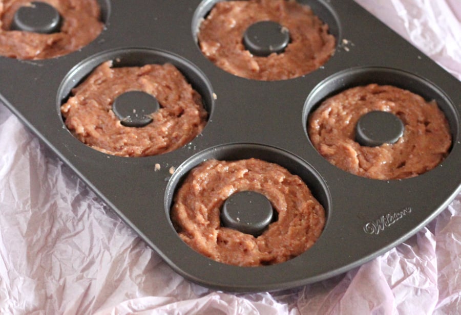 Pour/spoon into a greased doughnut pan using spoon or pour into ziploc bag, cut one end and pipe into pan.