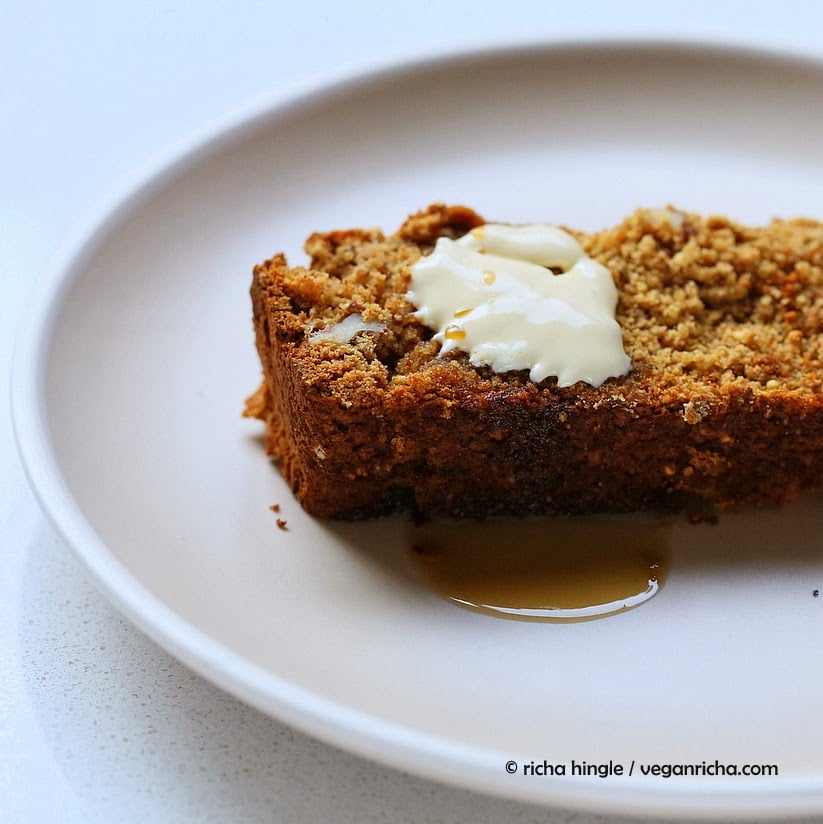 Something like chickpea flour in a baked dessert is always detected by my tongue quite instantaneously and not liked. I have tried bean flour in yeast breads and baked desserts before and I know which way I like it or not. And this inspite of me eating Indian sweets made entirely of chickpea flour(besan laddoo!). So to just give it a go again, I reduced the garfava flour in Rickiโs all purpose gf mix to like a Tablespoon and added more of teff. We loved the loaf fresh that day with some butter and maple. The next day however hubbs made a face about the bean after taste:). I should have substituted all of it out. I love chickpea flour in savory food any which way.ย