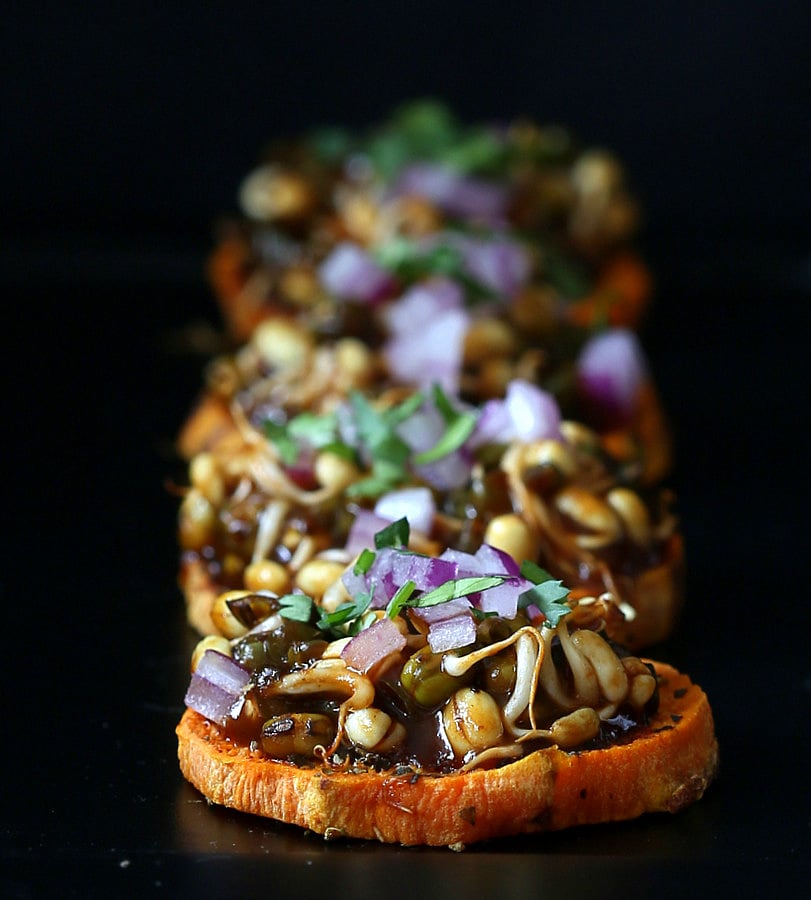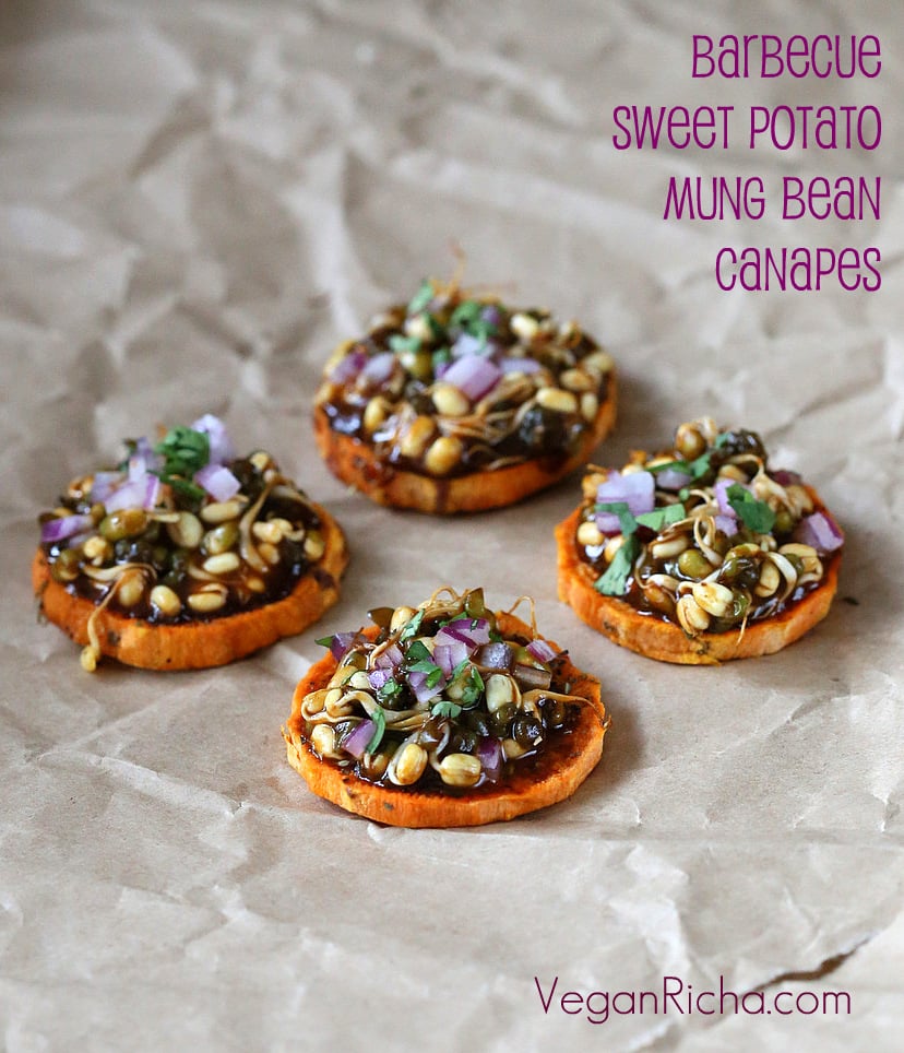 Sweet Potato Canapes with BBQ Mung Bean Sprouts