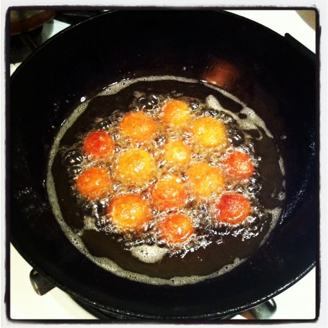 - Remove the balls once golden brown all over, not dark brown.(6-8 minutes). Let the balls sit out for a minute before adding to the hot sugar syrup.