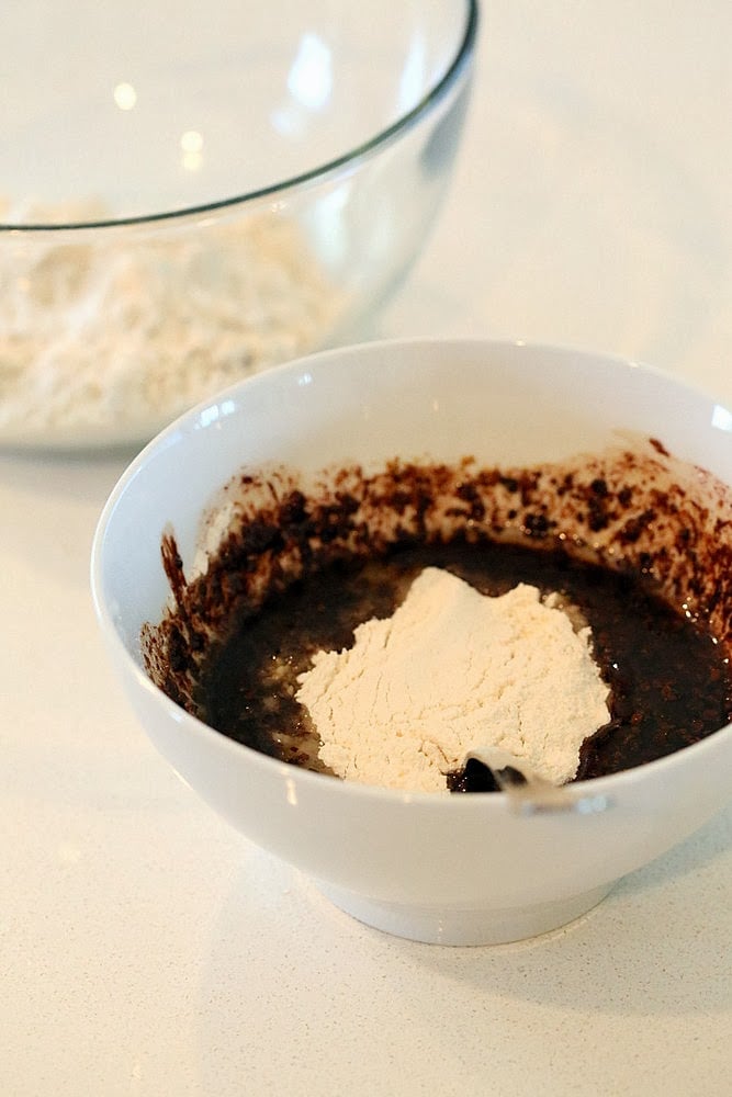 Melt the chocolate. Add flaxmeal, oil, coffee and sugar and mix well. in another bowl, mix in the dry ingredients.