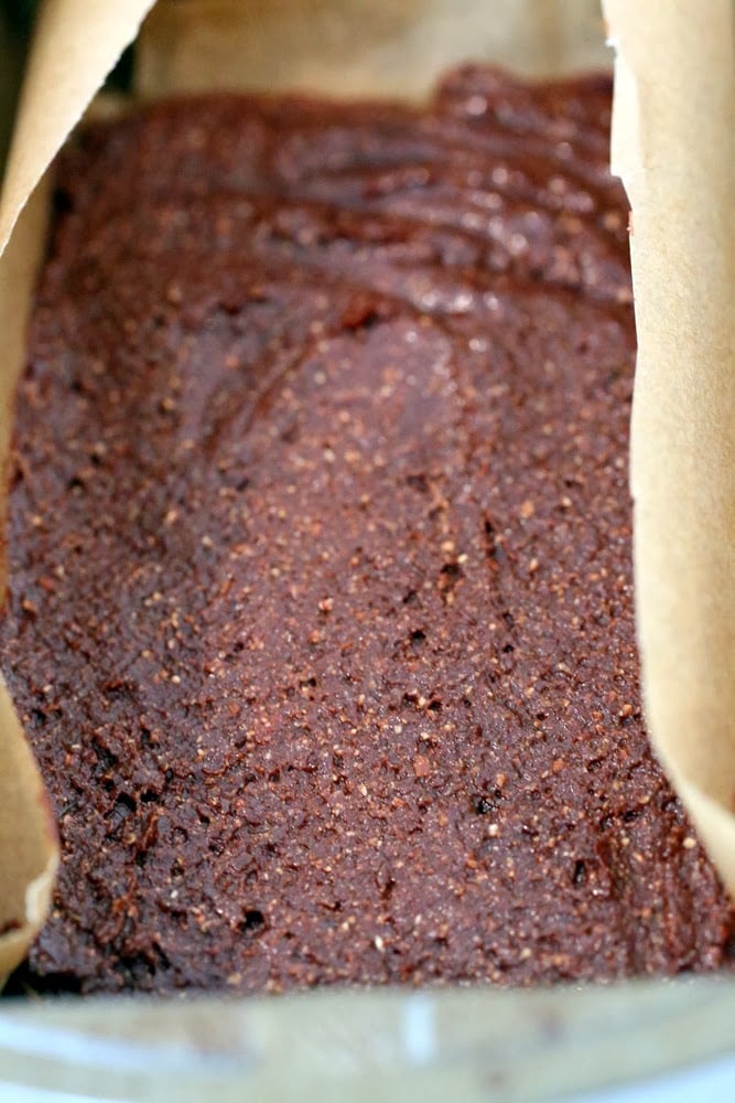 - Line a ceramic or glass 9 by 5 loaf pan with parchment. In a bowl, add all the dry ingredients under Brownie and mix well. Heat non dairy milk and maple syrup until hot (in pan or microwave). Whisk in the dark chocolate and flax seed meal and mix until the chocolate melts. Add the rest of the ingredients and mix well. Add the wet mixture into dry and mix to combine. Mix in 1/4 cup chocolate chips into the batter. Drop the batter onto prepared parchment lined pan. Spread it using a spatula to even it out. (For flavor variation Add 2 tsp espresso to the batter for a coffee flavor or add a few drops run extract) Reserve a Tablespoon of the batter to make swirls on top(optional).