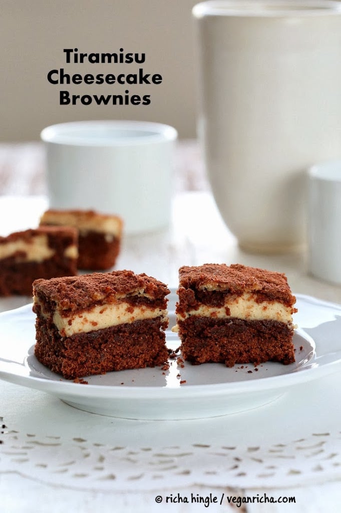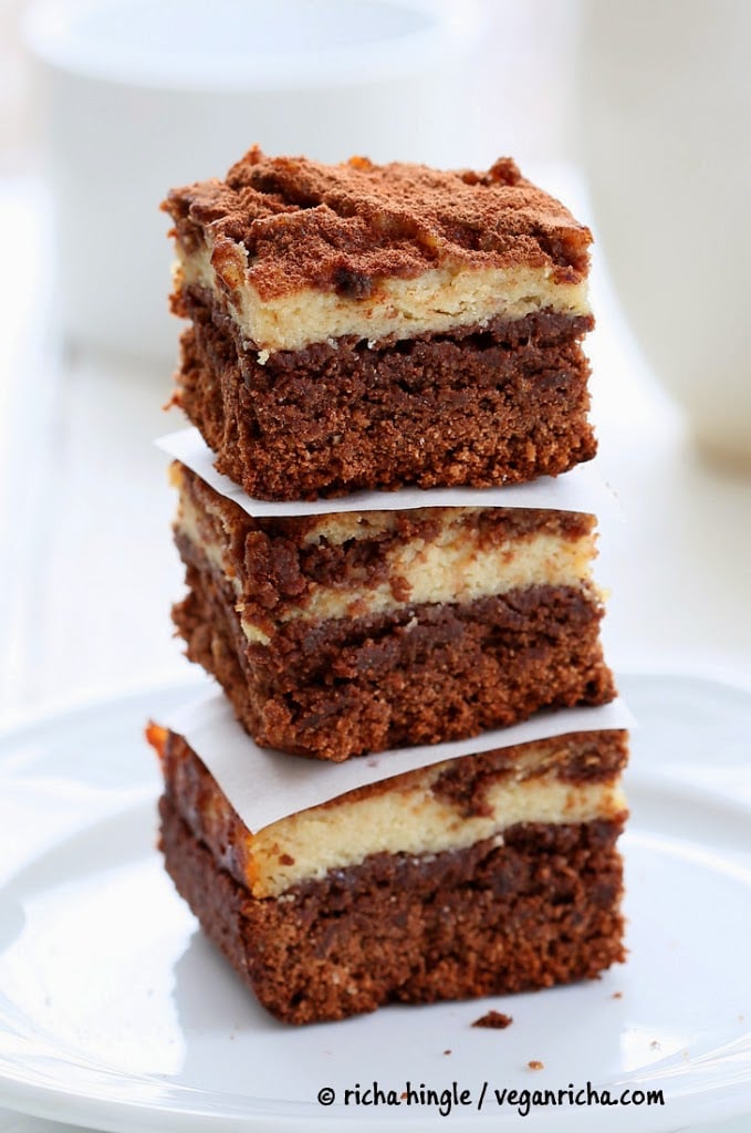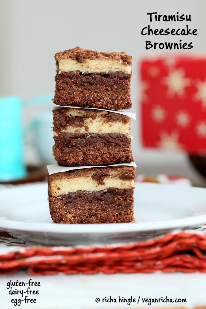 I had pinned Roxana’s Cheesecake Tiramisu Brownies a while back and the past few days were a perfect time to vegan-ize them. The cheesecake layer is a bit thin as hubbs was never fond of cheesecakes and I did not want to eat the entire pan by myself :).Which I wouldn’t usually mind, but then it is the holidays, gotta share:). He loved the balance of flavors and these were a big hit with everyone visiting as well! You can easily double the cheesecake layer and make them taller.