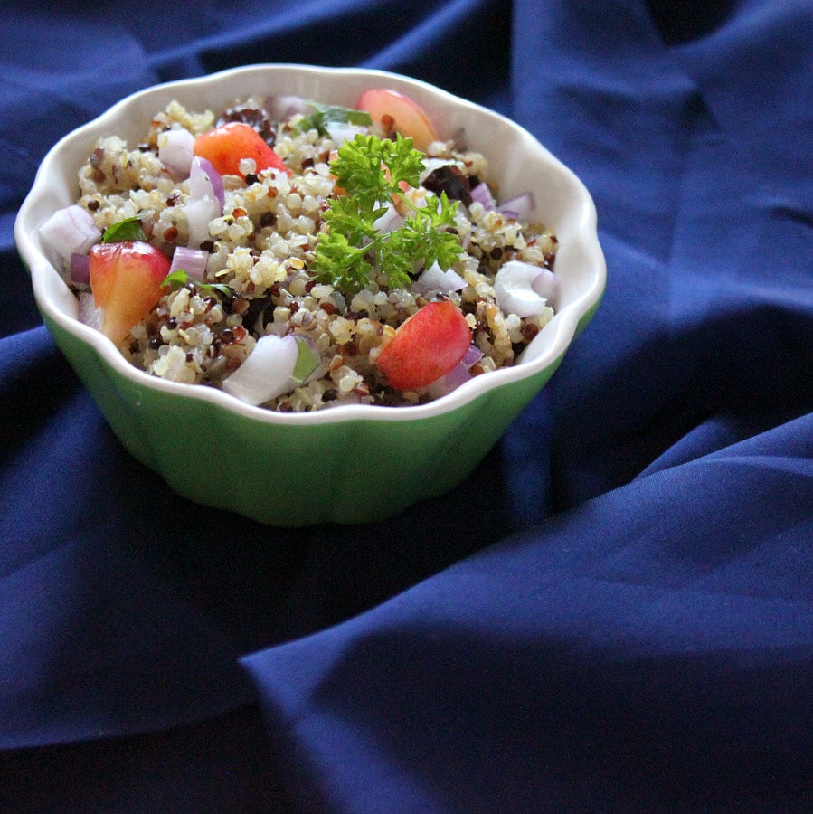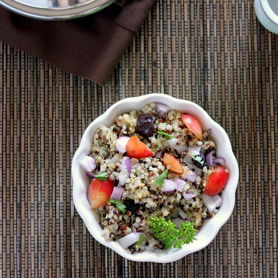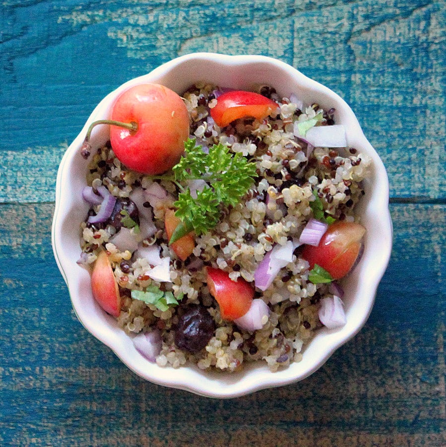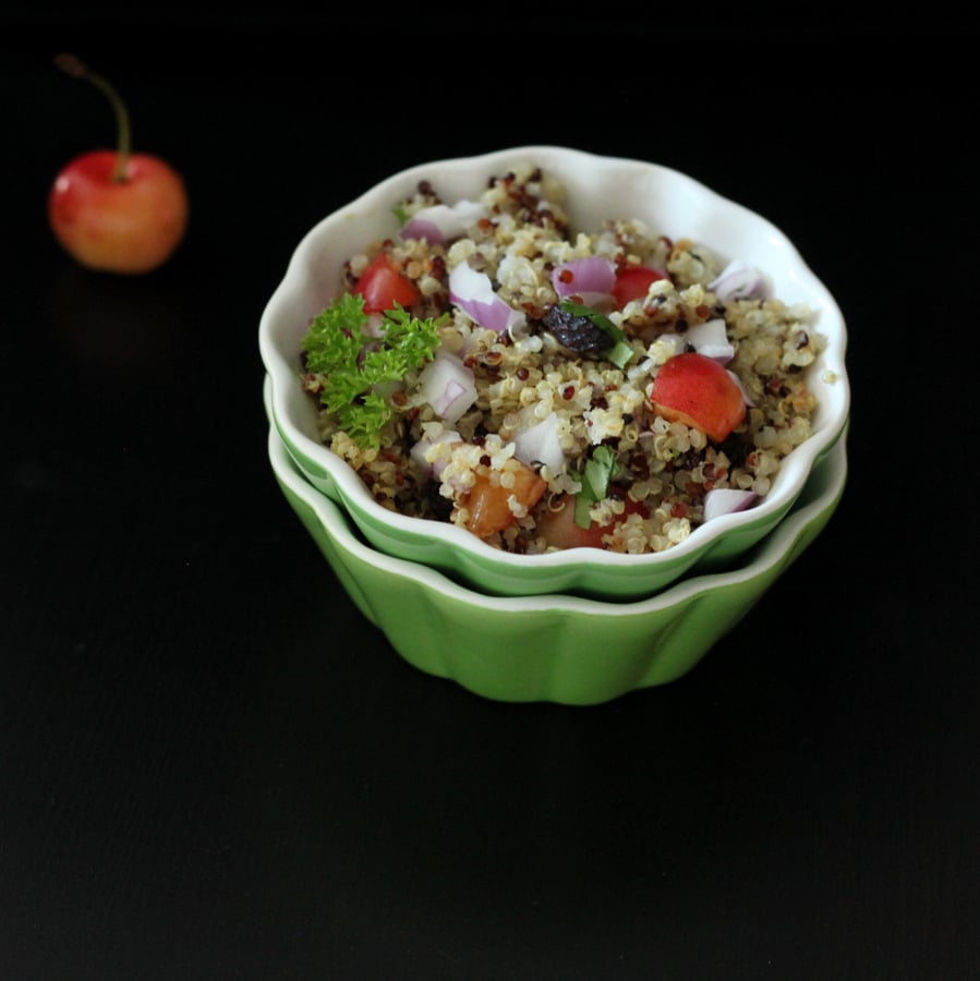 I think Quinoa and red onions are a match made in food heaven. If you havent tried them together, you are missing something. This is a simple salad that I have been making variations of all this season. Some fluffy quinoa, red onions, chopped fruit of the season like cherries and some dried fruit like raisins.