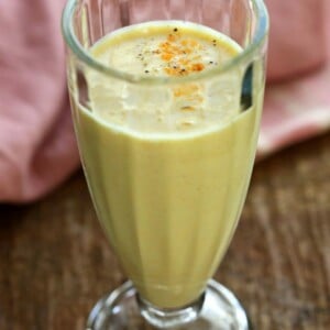 Turmeric Lassi – Golden Yogurt Drink. Lassi is a yogurt based drink served as a beverage in India. This version uses non dairy yogurt, turmeric, black pepper and ginger for a cooling Lassi. Vegan Gluten-free Recipe.