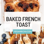 Vegan Baked French Toast Casserole is an easy-to-make morning breakfast bake the whole family will love! Pieces of bread are covered in homemade vanilla and almond-kissed vegan cashew custard, topped with a brown sugar cinnamon topping, and fresh blueberries.