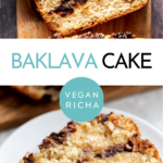 This easy baklava cake is a moist delicious cake with a nutty baklava-style filling used as a topping and a swirl! It’s decadent and delicious without being overly sweet! GF Oil-free options included.