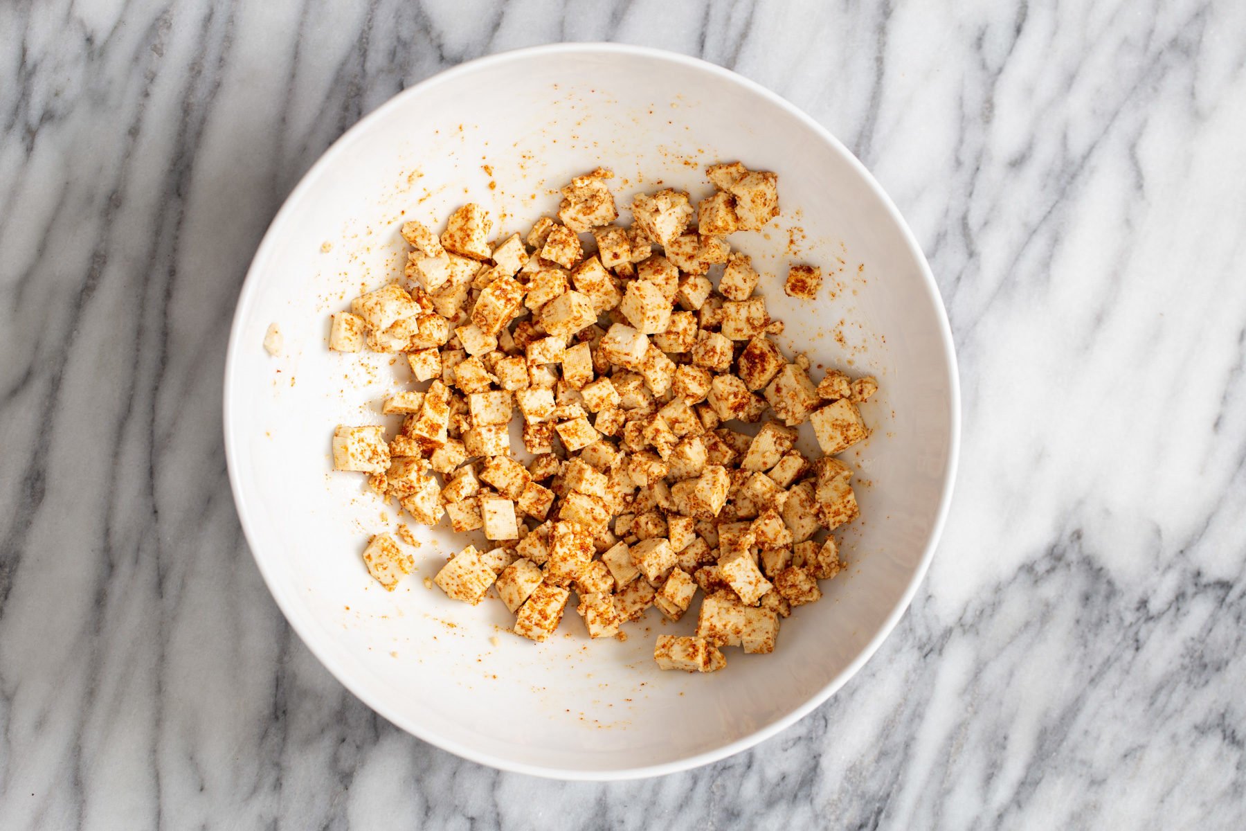 - Meanwhile, make the smoky tofu by combining the cubed tofu with the oil, soy sauce, smoked paprika, garlic, and maple syrup in a bowl to coat really well.