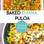 Baked Vegan Chana Pulao is a simple and easy, baked chickpea rice pilaf casserole that comes together quickly but is loaded with flavors. Serve with my quick raita. 1 Pan Gluten-free Soyfree Nutfree.
