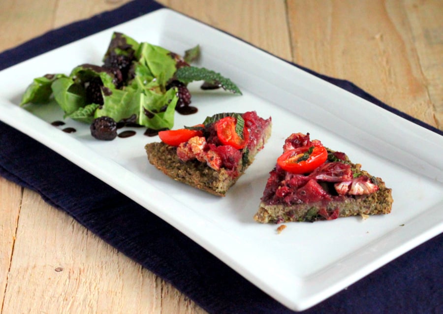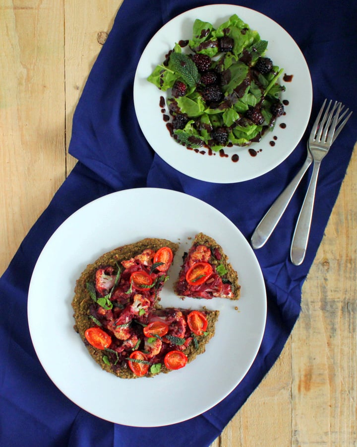 Black-eyed Pea Pizza crust, Blackberry Tomato chutney w/ Cauliflower, and Spinach Blackberry Mint Salad. Glutenfree, recipe