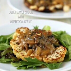 Cauliflower Steaks with Mushroom Gravy. Easy Roasted Cauliflower Slices served with mushroom thyme gravy. Vegan gluten-free Festive Main for the holidays.