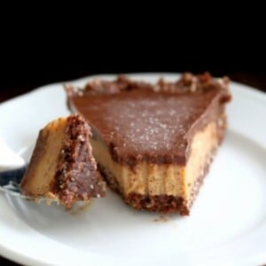 This Vegan Salted Caramel Pie has layers of Salted Date Caramel, Chocolate Mousse and Almond Hemp Chocolate Crust. No Bake Gluten-free palm oil free Makes 1 9 inch pie or tart pan