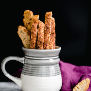 These Vegan Churro Biscotti with Cinnamon Sugar are perfectly crunchy for dunking in a hot cup of coffee, tea, or cocoa, or on their own. Impossible to eat just one!