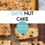 This easy vegan date nut cake is moist, fluffy, and packed with chewy dates and crunchy pecans and walnuts! So simple to make and the perfect sweet treat to bring to a potluck or bake sale. Gluten-free option.