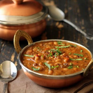 Start up with small servings of this tomato soup or Kachumbar salad and warm chips or Mathri. The kachumbar salad (onion, cucumber, radish salad) is a great side with the meal too. I usually don’t plan elaborate pre-meal snacks as then people fill up on those and the meal has a lot of leftovers 🙂