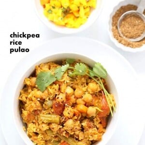 Chickpea Rice Pulao with Pulao/Biryani Masala. Easy One Pot meal w/ chickpeas, basmati rice and vegetables. Vegan Gluten-free Soy-free Nut-free Recipe. Can be made oil-free