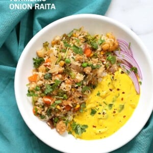 Indian Spiced Masala Fried Rice with Turmeric Onion Raita. Use up the leftover rice or grains to make this quick spiced fried rice and serve with a simple yogurt raita that is spiced with turmeric and mustard seeds. Vegan Gluten-free Soy-free Indian Recipe