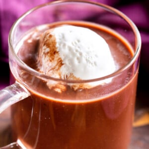 - Pour the hot chocolate into your cup. Top with your favorite vegan whipped cream or vegan ice cream and serve.