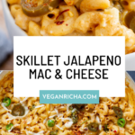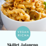 This Vegan Jalapeno Skillet Mac and Cheese is made in just 1 Skillet! No need for multiple pans! A 30 minute simple vegan spin on a family dinner favorite that is perfectly cheesy with a kick of heat from the added jalapenos. Options for gluten-free soyfree nutfree