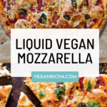 Learn how to make the perfect vegan liquid mozzarella that bakes up to gooey, melty  cheese perfection when drizzled over homemade vegan pizza! Gluten-free option included.