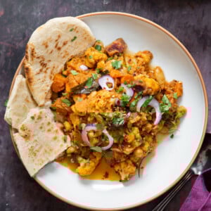 This sauce is usually used with chicken. However, it also goes well with veggies or chickpeas or beans too. I use a mix of veggies and beans to make a hearty protein-rich curry that bursts with various flavors with every bite.