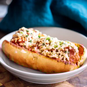 We have baked lentil meatballs covered with marinara and melty vegan cheese served over an oven-toasted bun that gets brushed with garlic butter! YUM! Also all baked in the same pan so fewer dishes!