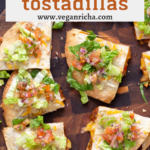 They are like a quesadilla but baked instead of pan-fried – so more like a tostada. But I’ll explain the difference in a second and just call these tostadillas for now. Some might know these under Mexican Pizzas. You can call them whatever you want as long as you try them because these are delish. Admittedly, they are messy to eat! So not the best thing to serve for a first date – but every bite is a heavenly combination of crunchy – toasty and savory- cheesy that will make you fall in love with these double-decker vegan tostadas!