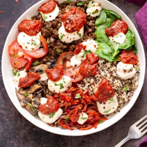 Assemble the bowl: Add a good helping of the lentil sausage mix, the quinoa, the roasted veggies and mushrooms, greens, chopped tomatoes, then top it with dollops of pizza sauce and dollops of the cashew mozzarella sauce.